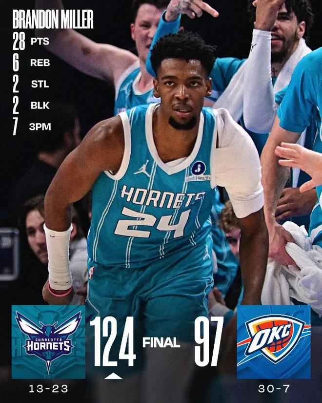 米勒28分6板 黄蜂大胜雷霆27分