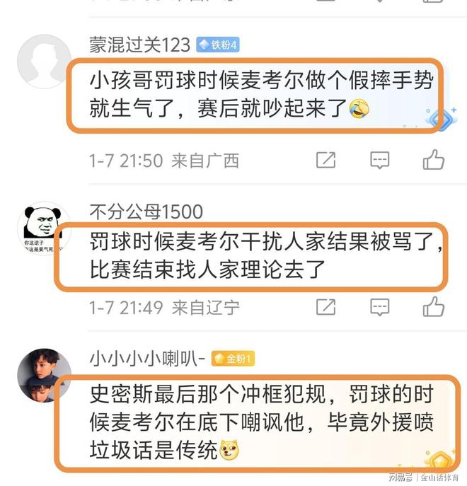 有几位现场球迷,赛后也道出真相。“小孩哥罚球时候麦考尔做个假摔手势就生气了,赛后就吵起来了”;“罚球时候麦考尔干扰人家结果被骂了,比赛结束找人家理论去了”;“史密斯最后那个冲框犯规,罚球的时候麦考尔在底下嘲讽他,毕竟外援喷垃圾话是传统。”。