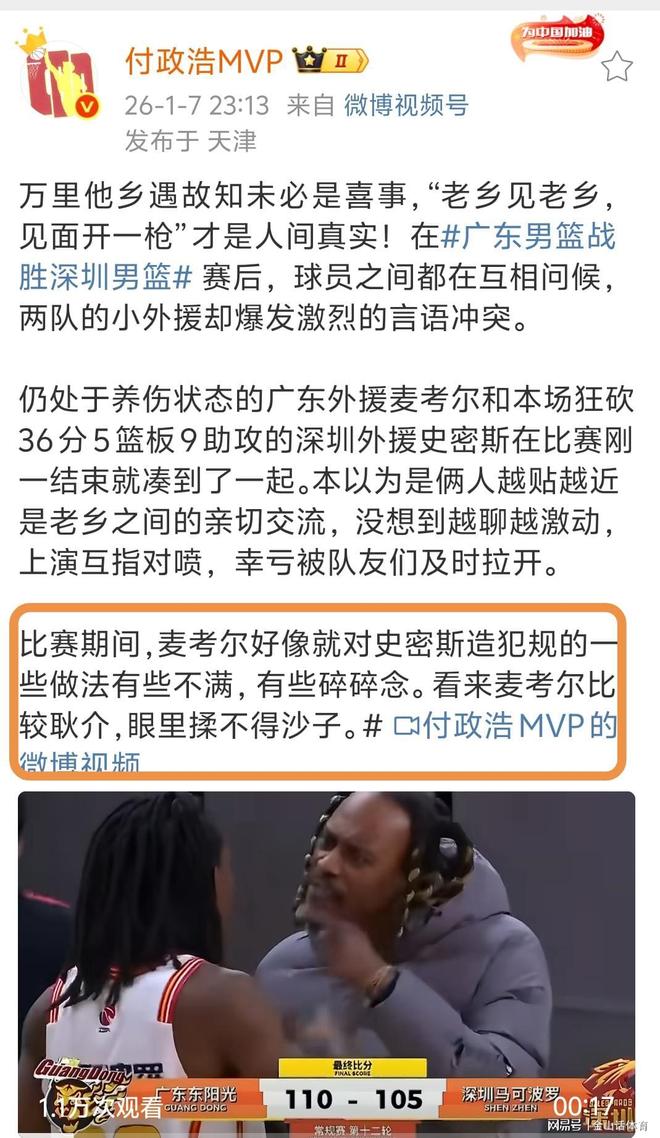 赛后,媒体人付政浩还原了事情真相。他在个人社媒透露,“万里他乡遇故知未必是喜事,‘老乡见老乡,见面开一枪’才是人间真实!在赛后,球员之间都在互相问候,两队的小外援却爆发激烈的言语冲突。仍处于养伤状态的广东外援麦考尔和本场狂砍36分5篮板9助攻的深圳外援史密斯在比赛刚一结束就凑到了一起。本以为是俩人越贴越近是老乡之间的亲切交流,没想到越聊越激动,上演互指对喷,幸亏被队友们及时拉开。比赛期间,麦考尔好像就对史密斯造犯规的一些做法有些不满,有些碎碎念。看来麦考尔比较耿介,眼里揉不得沙子。”。